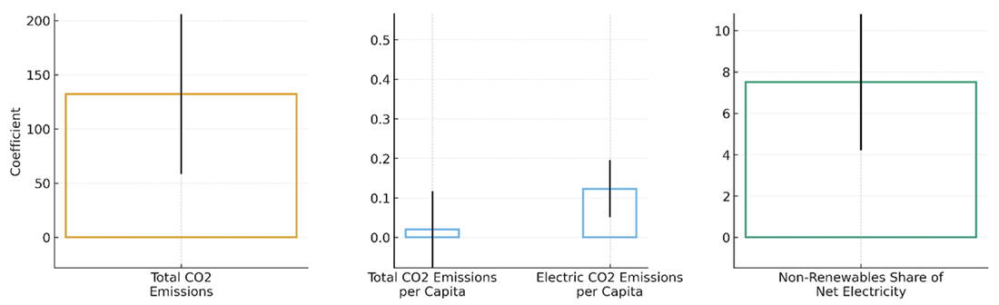 Our fourth and final result is that the location of data centres matters. Since electricity cannot be stored at scale easily, the grid must balance supply and demand in real time. Given the high transmission-loss costs, power plants are influenced by nearby sources of demand, especially from data centres which require a stable, high-capacity electricity supply. Consistently, we find that proximity to data centres is associated with power plants generating higher CO2 emissions and relying more heavily on non-renewable energy sources (Figure 3).