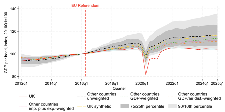 Figure 1 shows that before the referendum, UK GDP per capita grew at broadly the same pace as in the comparison group. After 2016, the lines diverge. By the year to 2025 Q1, UK GDP per head had grown 6–10 percentage points less than in comparable economies, and only about 4% in absolute terms over the whole period. Our central estimate – the average across the five weighting schemes – is that UK GDP per head has grown by a total of around 8% less than that of comparable advanced economies since 2016.