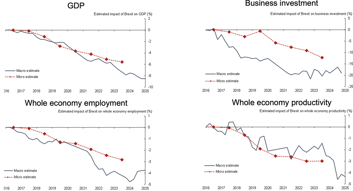 The micro approach has a different set of considerations to the macro approach. The more direct link to EU exposure can help to better identify the causal effects of Brexit. But we have to assume that unexposed firms were not affected by Brexit, when in fact they could have faced negative spillovers (for example, through demand or supply chains) or positive spillovers (for example, through the labour market if unexposed firms found it easier to hire workers). Broadly speaking, the macro- and micro‑based estimates of the impact on GDP, investment, employment and productivity line up reasonably well, with the macro estimates typically being the larger of the two (Figure 2).