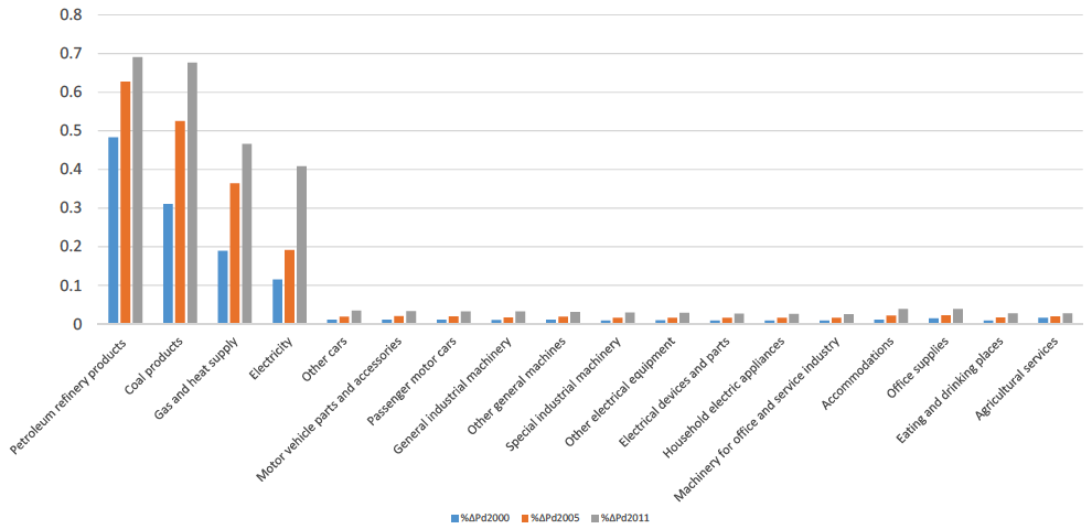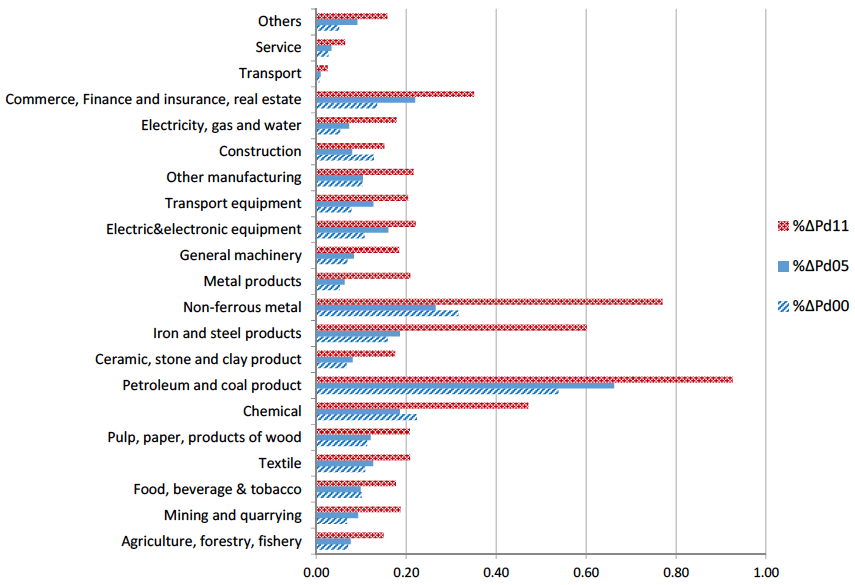 図2は2000年、2005年、そして2011年の産業連関表を用いたパススルー率の分析結果である。第1に、パススルー率は上昇傾向にあり、2011年表を用いた推定結果が最もパススルー率が高くなる。第2に、一般機械(General machinery)、電気・電子機器(Electric & electronic equipment)、輸送用機器(Transport equipment)の2011年のパススルー率は約20%(0.20)となり、単一方程式の推定結果と比べて高い値となっている。第3に、石油石炭製品(Petroleum and coal product)や非鉄金属(Non-ferrous metal)など資源エネルギー関連産業ではパススルー率が非常に高い値をとっている。たとえば、原油の輸入は基本的に米ドル建てで取引される。原油輸入のシェアが高ければ、それだけ円ドル・レートの変動に伴うパススルー率も高くなると解釈できる。