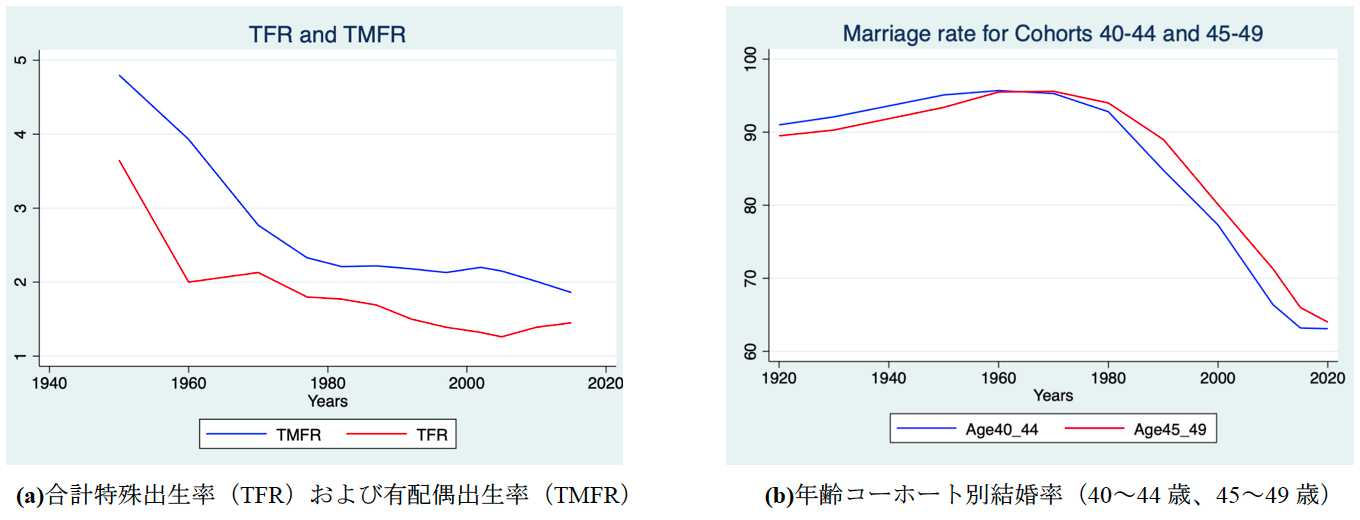 日本は、持続的な少子化、長期的な結婚率の低下、そして女性の労働力が十分に活用されていないこと、という相互に密接に関連した人口動態上の課題に直面している。図1はこれらの傾向を示している。(a)では1980年から2000年にかけて、合計特殊出生率(TFR)が低下を続ける一方で、有配偶出生率(TMFR)は、相対的に安定して推移していることが分かる。この乖離は、日本の出生率低下が、結婚後の出生行動の急激な変化によるものではなく、結婚する人の割合そのものが減少していることによって主に引き起こされていることを示唆している。(b)は、40~44歳および45~49歳のコーホート別結婚率が大きく低下していることを示しており、未婚化が一時的な晩婚化ではなく、ライフサイクルを通じた恒常的な現象であることを裏付けている。