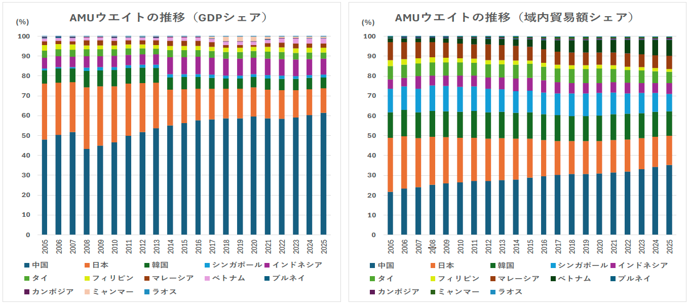 AMUのバスケット・ウェイトは、ユーロ導入以前に欧州市場で創出されたECU(欧州通貨単位:ユーロの前身)の計算方法に従い、域内貿易シェアと購買力平価で測ったGDPシェアの算術平均に基づいて算出している。しかし、図1が示す通り、直近のデータでは中国のPPP-GDPシェアは約60%に達し、域内貿易シェアも約30%に上昇した一方、日本のシェアは年々どちらも低下している。周知のとおり、中国の域内貿易量やGDPの増加の背景には、日本や韓国をはじめとする海外多国籍企業のサプライチェーン拡大が寄与している。日本の域内貿易シェアの低下は、日本企業の生産拠点のアジア移転が原因であることを考慮すると、従来のバスケット・ウェイトはアジアの現況を十分に反映しているとは言い難い。