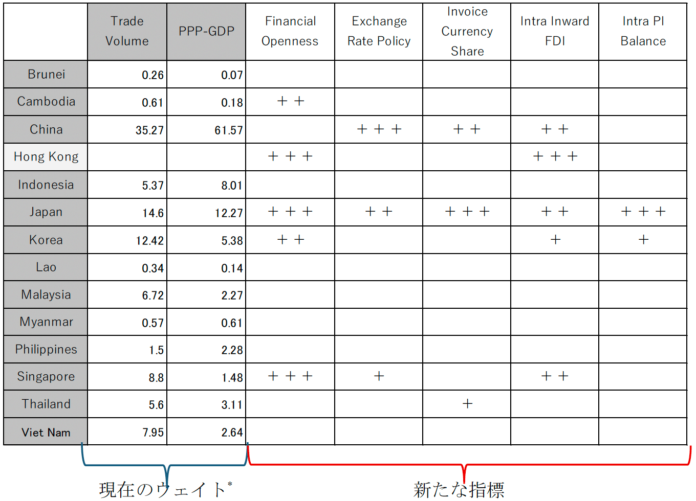 以上の結果をまとめると、表1のようになる。新しいAMUを構築するのであれば、従来の貿易シェアやGDPだけでなく、各国の為替政策、域内貿易におけるインボイス通貨シェア、域内FDIのシェア、域内一次所得のシェアなどの要素を組み込むことで、一国集中からよりバランスが取れたものになる。今後の課題としては、域内の貿易のみならず、資本フローの動きを捉えることがより重要となってくるため、実務上の観点を重視して各国の資本規制や市場開放度などを示す要素も取り込み、債券市場や株式市場のサイズなどのデータをもとに、金融市場関連データを追加する必要がある。また、本論文では、アジアの生産ネットワークと垂直貿易に関して、第一次所得収支データを用いて代替したが、数値的にバスケット・ウェイトに反映させるためには付加価値貿易の観点や産業連関表を用いて、より包括的なデータを構築することが必要となる。域内のFDIについても、シンガポールや香港はあくまで他国からの中継地というのが実態であることから、元々の出資国はどこなのかもを考慮したデータを構築にも取り組む所存である。