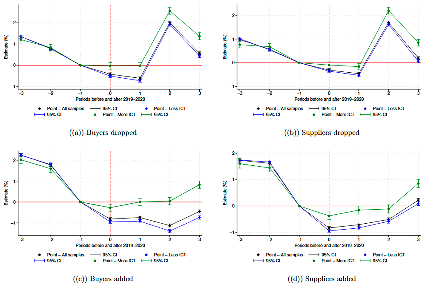 具体的には、パネル(c)と(d)では、ICTの活用度が低い産業の企業(青い線)のバイヤーリンクとサプライヤーリンクの創出が、パンデミック発生時にゼロベースラインを大幅に下回り、その後も低迷が続くという明確な乖離が見られる。対面でのやり取りに依存しているデジタル制約のある企業は、新しいパートナーを効果的に探すことができなかったと推測される。対照的に、ICTの活用度が高い産業の企業(緑の線)は顕著な回復力を示し、ベースライン付近または上回っている。さらに、このような産業では、企業はより遠方の企業と取引を開始したことが示された。ICTの活用度が高い産業の企業がデジタルツールを活用することで、遠隔地でのパートナー探しに伴う情報摩擦を軽減できると説明できる。