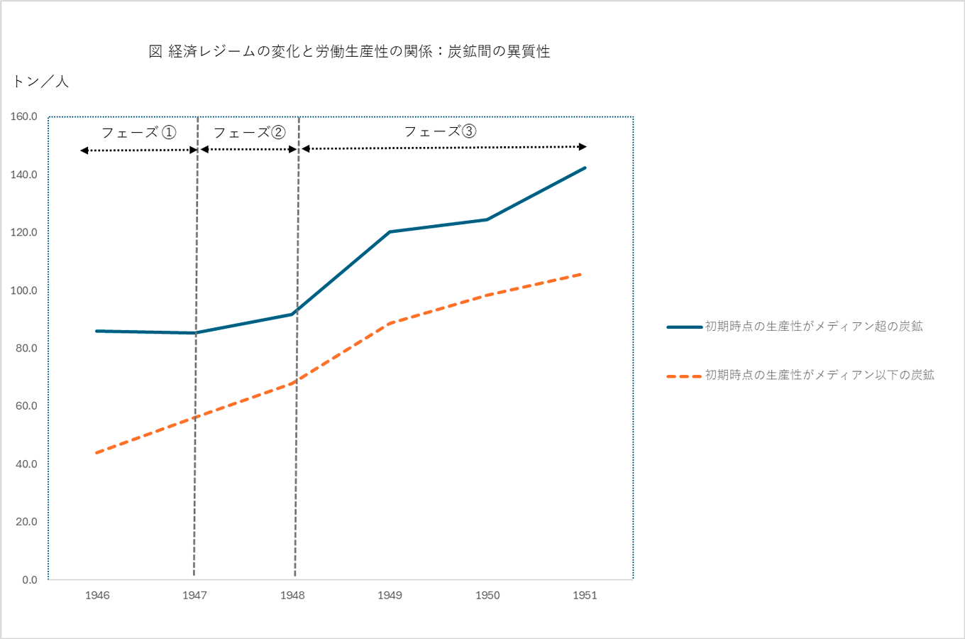 第2次世界大戦直後、米国による占領下で、日本政府は生産回復とインフレ抑制を通じた経済復興のための諸政策を実施した。この間、米国の政策変化を反映して、日本政府の政策は3つのフェーズを経過した。①生産の量的増加を最優先とし、生産性上昇を顧慮しないナイーブな経済統制、②生産性上昇をめざした経済統制、③市場経済への移行である。本論文では、こうした政策レジーム変化の経済的含意を、石炭鉱業を対象として研究した。新たに構築した炭鉱レベルのパネル・データの分析を通じて、第一に、ナイーブな経済統制、特に価格統制が石炭企業、特に初期時点で生産性が相対的に高かった石炭企業の生産性上昇へのインセンティブを歪め、これら企業の生産性が停滞したことが明らかになった。第二に、1948年以降、生産性上昇をめざして経済統制の方式が変更されたが、この変化は生産性に有意な効果を持たなかった。第三に、市場経済への移行は生産性上昇にプラスの効果を持った。ただし、下図が示すように、この効果は炭鉱の属性によって異なり、プラスの生産性効果があったのは、経済統制の下で生産性上昇へのインセンティブを歪められていた初期時点に生産性が高かった炭鉱のみであった。