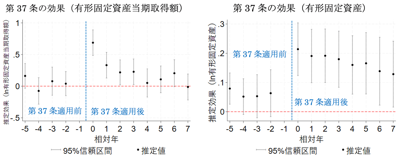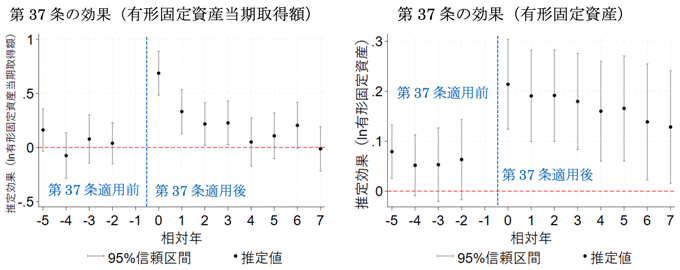 さらに、本研究では「企業活動基本調査」(2010〜2019年)の企業レベルデータと復興特区税制の活用事業者名簿を組み合わせ、第37条(投資減税)および第38条(被災者向け給与に対する控除)の効果を企業ごとに検証した。企業が特区税制の適用を受けた年を基準としたイベントスタディによって政策の効果を時系列で捉えた結果、第37条の適用を受けた企業では、適用年に有形固定資産当期取得額が69%増加し、1〜3年後も22〜33%程度の増加が継続した。これらの投資増加は企業の資本ストックにも反映され、固定資産残高が13〜21%程度上昇したことが確認された。すなわち、第37条は震災後の被災企業に対して明確な投資促進効果を持ち、生産基盤の再建を後押ししたと考えられる。一方、第38条については、給与総額・従業員数ともに短期的に小幅の増加がみられる期間はあるものの、効果は持続的・統計的に安定したものではなかった。これは、第38条が「新規雇用の創出」ではなく「震災時点の従業員の雇用維持」を目的とする制度であり、雇用を大きく削減する企業が対照群にも少なかったことから、差として効果が検出されにくかった可能性が高い。