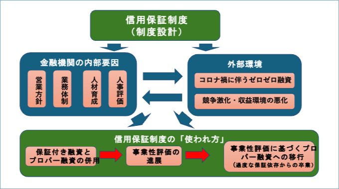 図に示すように、信用保証制度の「使われ方」は、制度設計だけでなく、金融機関の営業方針、人材育成、人事評価などの内部要因と、コロナ禍などの外部環境の双方によって決定されると考えられる。また、信用保証制度の利用は、保証付き融資とプロパー融資の併用や、事業性評価に基づくプロパー融資への移行など、金融機関の行動にも影響を与える。
