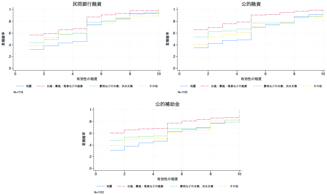 図1は、財物保険の有効性について、災害の種類ごとの主観的評価の経験的累積確率分布を示している。台風などの風害に対する保険が最も高く評価され、地震保険が最も低く評価されていることは明らかである。これは、地震や洪水への補償は標準的な保険契約ではオプションである一方、風害への補償は標準的な契約に含まれているという事実を反映している可能性が高い(注5)。また、ここには図を示していないが、保険が激甚災害以外の災害に対してより有効であるとみなされていることが示されている。