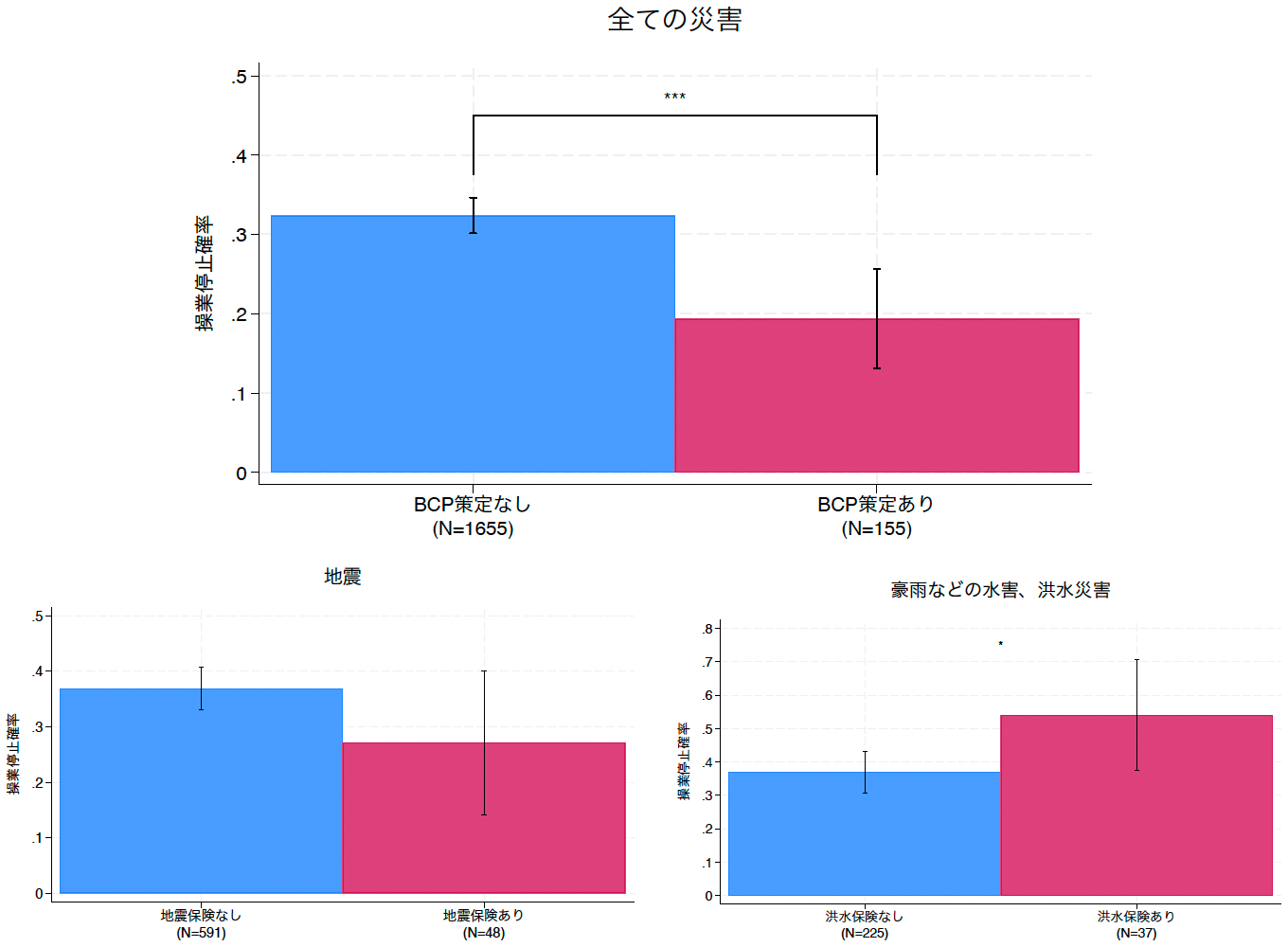 事業中断の抑制における対策の有効性に目を向けると、図3はBCPと地震保険がともに有効であることを示している。対照的に、洪水保険は負の効果をもたらしているように見える。これは「逆選択」(adverse selection)の存在、すなわち、洪水被害を受けやすい企業ほど洪水保険に加入しがちな可能性が高いことを示唆している。