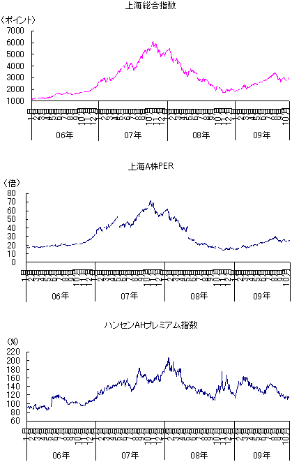 また、59の銘柄が上海市場(A株)と香港市場(H株)で同時に上場しているが、中国本土では非居住者による証券投資を制限するなど、資本規制が敷かれているため、両市場での株価は必ずしも一致していない。H株市場はファンダメンタルズを重視する海外の機関投資家が主体となっているのに対して、A株市場は中国国内の個人投資家が主体となっており、H株市場と比べて、投機性が強い。バブルの絶頂期にA株のH株に対する相対価格を示すAHプレミアム指数は一時200%を超えたが、現在120%まで縮小しており、A株の割高感は大幅に解消されている。